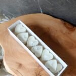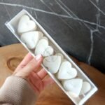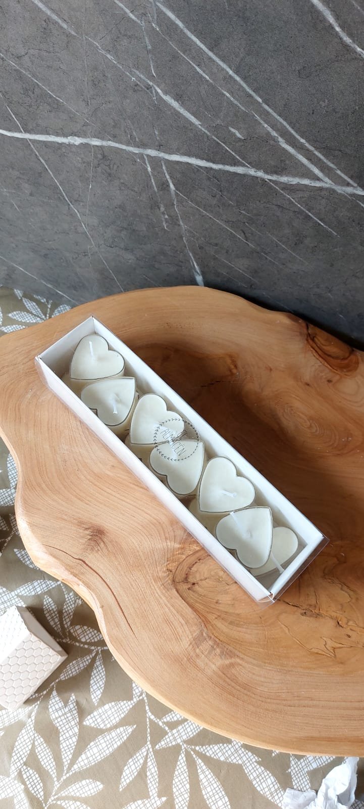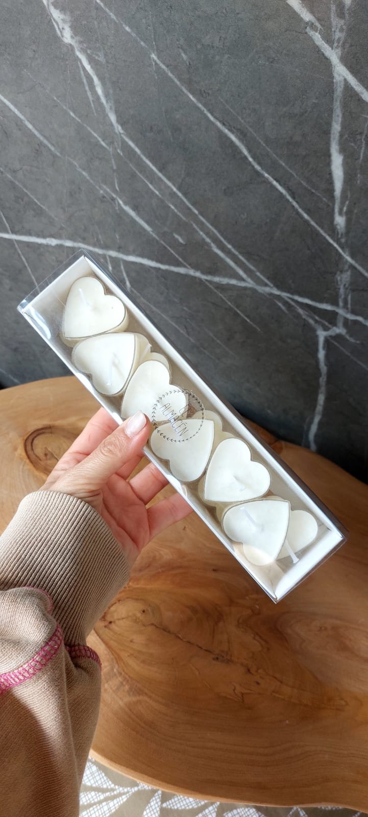 Box de 12 velas tipo tealights con forma de corazón, hechas con cera de soja natural y aromáticas.