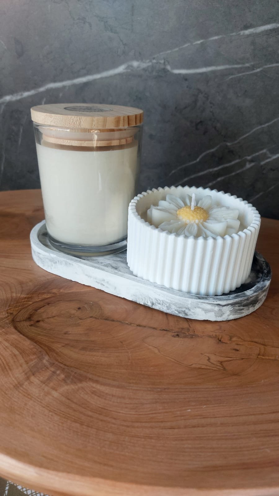 Vela FILIPA (vaso con tapa de madera) + Vela KIRI (pote de yeso con margarita) + Bandeja de yeso marmolada banco y negro