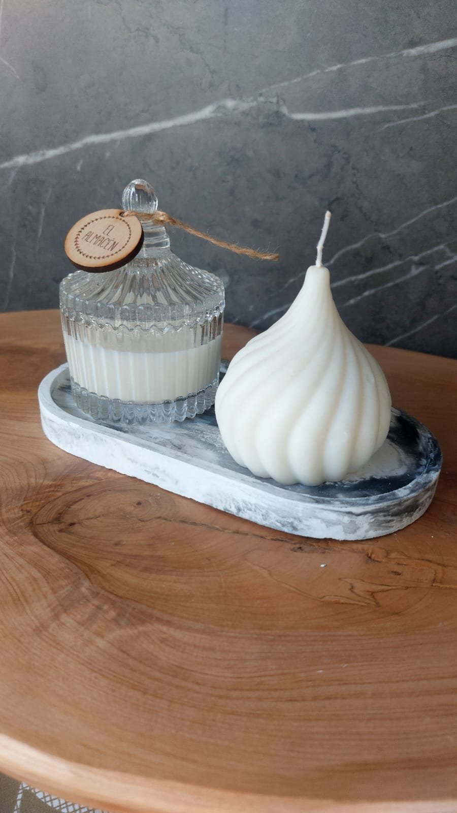 Vela TINA ( espiral) + Vela ELVA (caramelera) y bandeja de yeso marmolada blanca y negra.