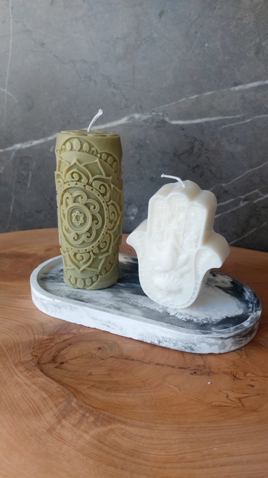 Vela HAMSA + Vela JUNO + Bandeja de yeso marmolada banco y negro