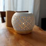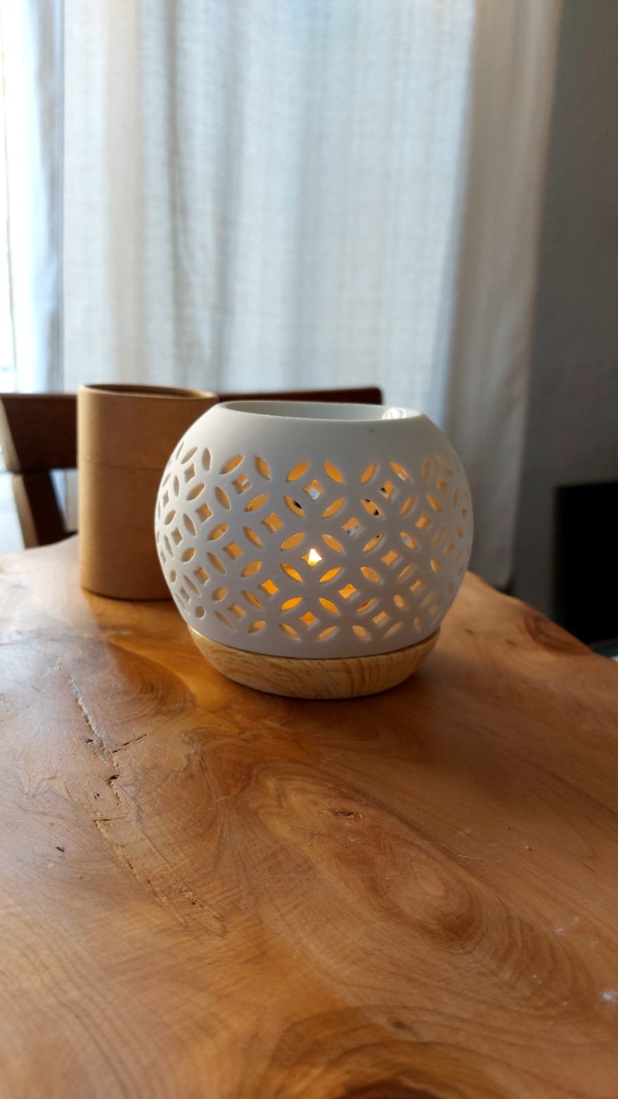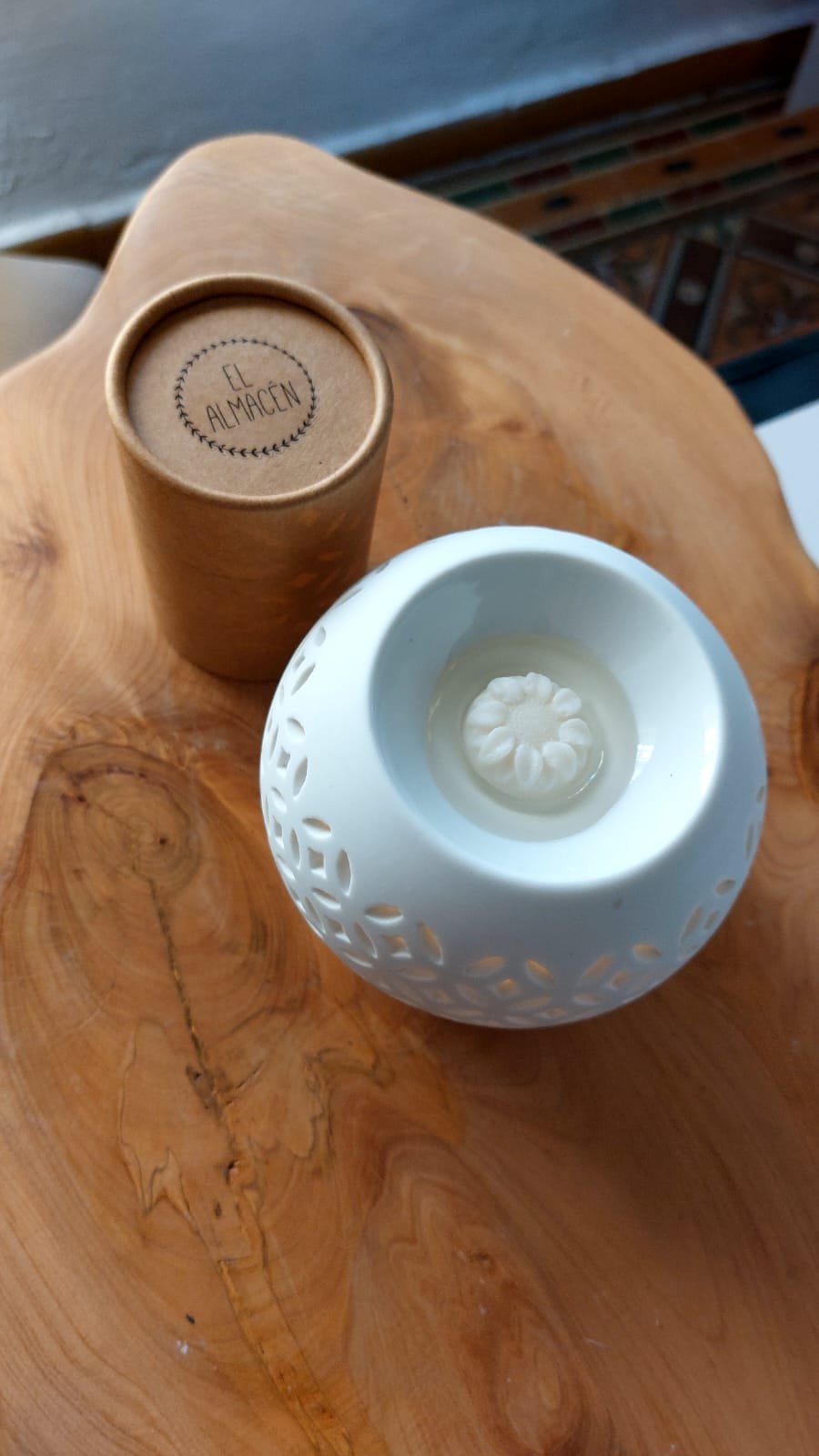 fanal y hornito de cerámica blanco con base en cerámica símil madera. box de melts aproximadamente 10 unidades, aroma a elección.