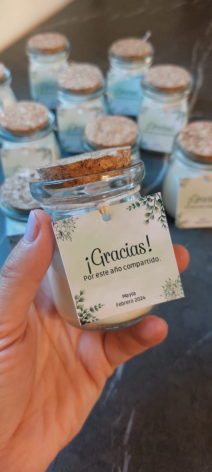 Están hechas con cera de soja 100% vegetal, disponibles en una amplia variedad de aromas, colores y presentaciones. Cada vela se personaliza con sticker o tarjetita de regalo sin costo adicional, para que cada detalle hable de vos.