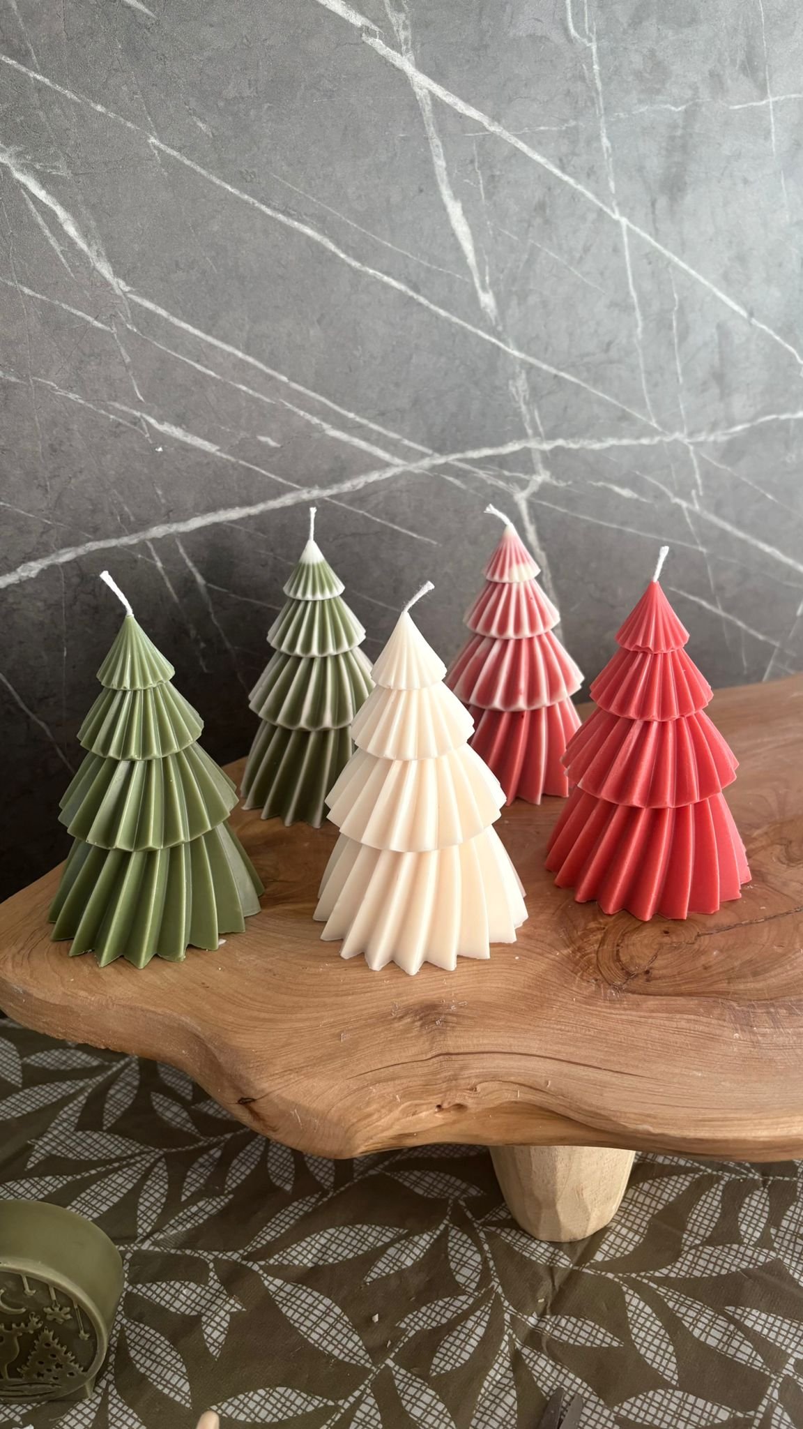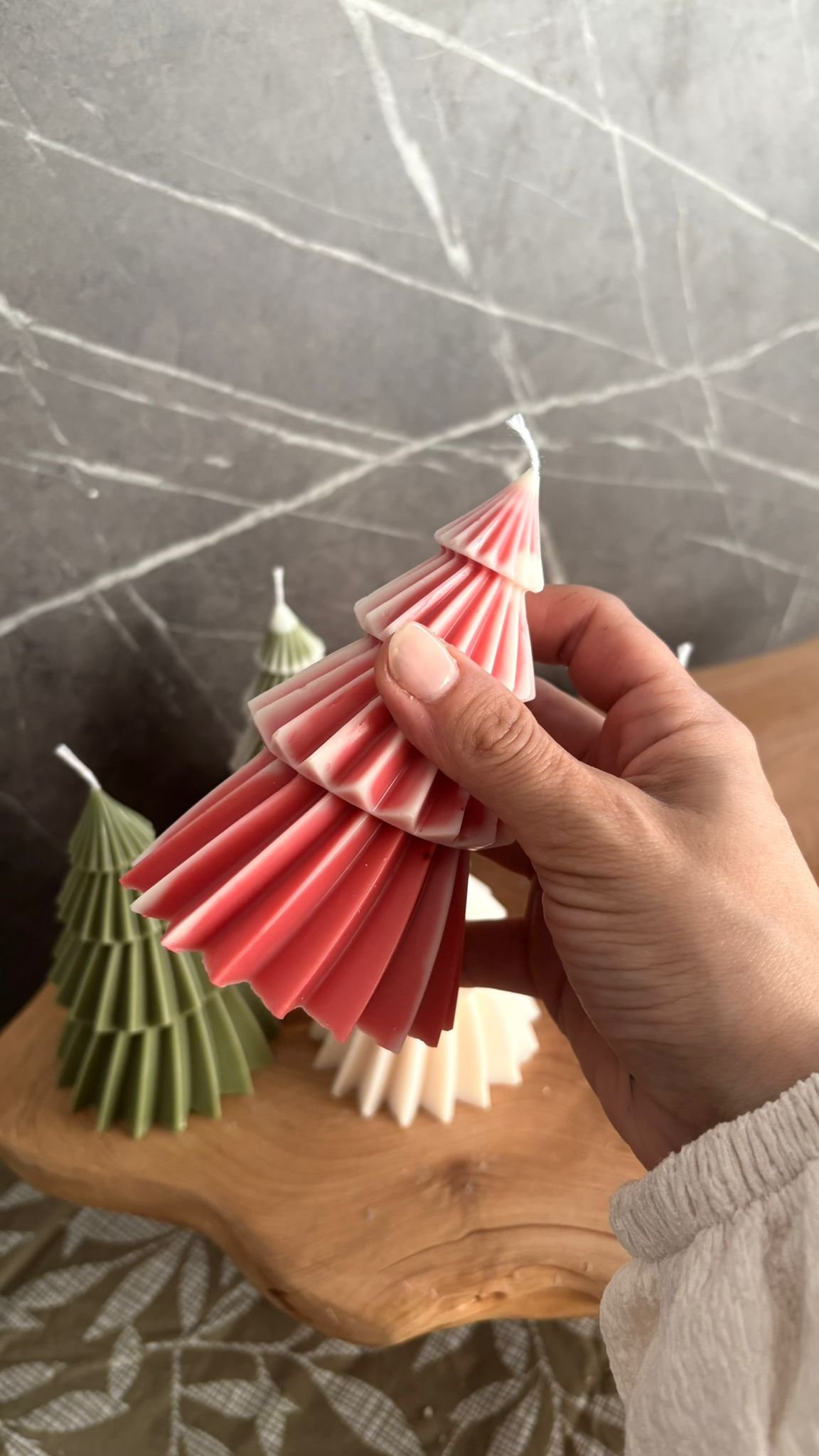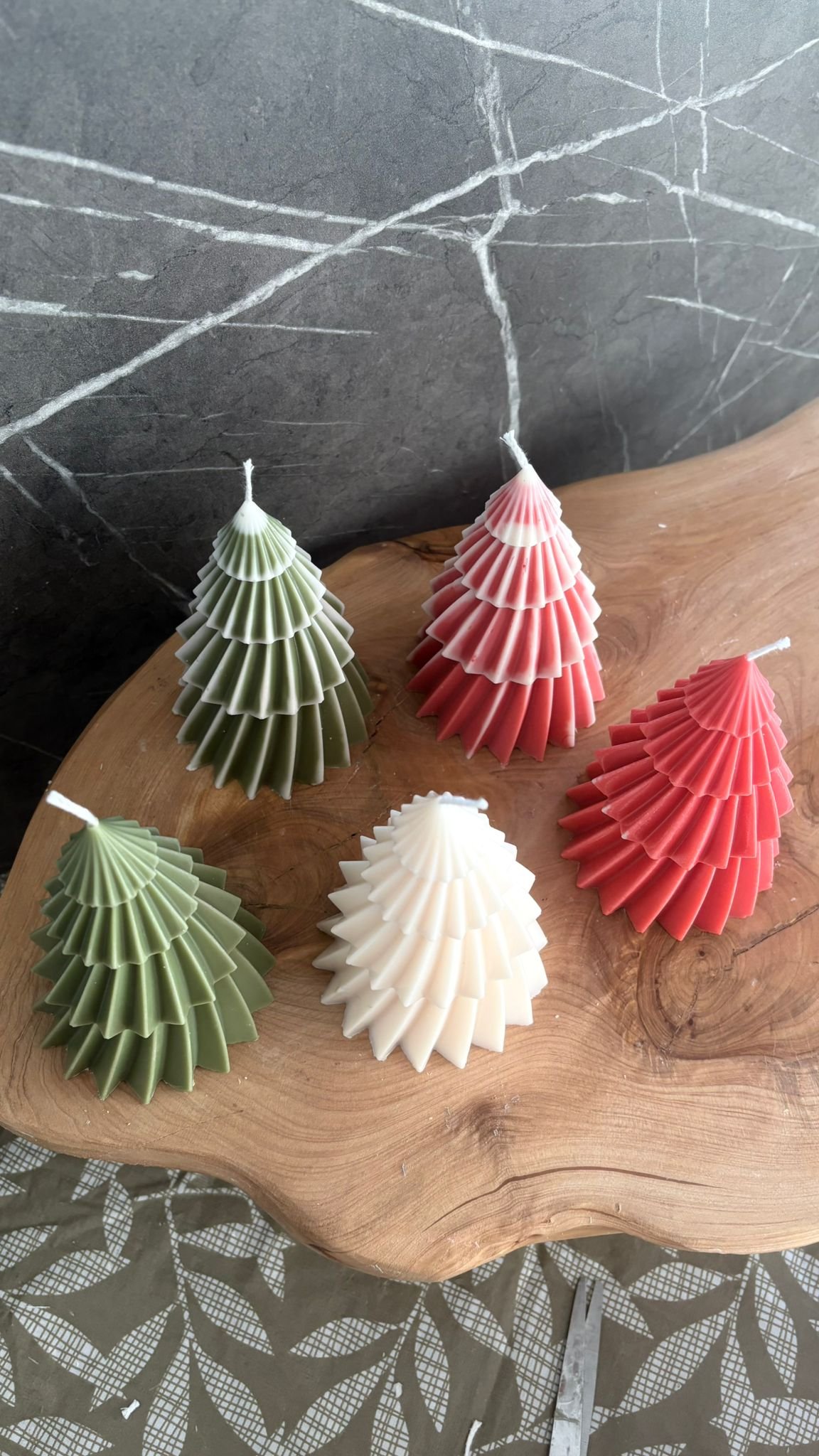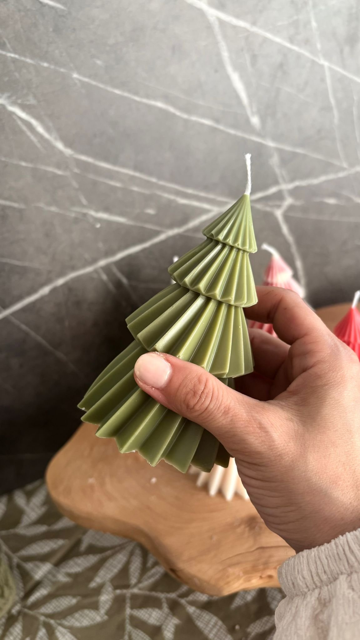 Dale a tu hogar el toque festivo perfecto con nuestra encantadora vela decorativa con forma de árbol de Navidad. Presenta un diseño de pino moderno con textura plisada o en capas que captura la luz de forma mágica. Disponible en colores clásicos navideños como el verde bosque, rojo intenso y un elegante blanco cremoso, es ideal para centros de mesa o para regalar en estas fiestas. Enciende el espíritu navideño con esta pieza artesanal.